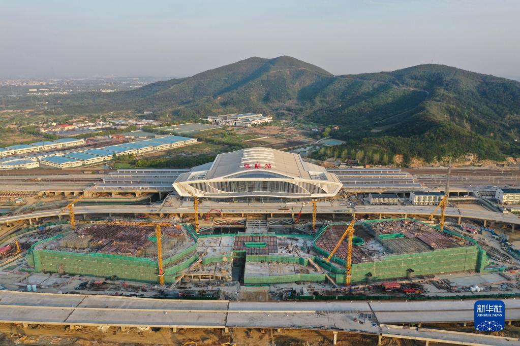4月10日拍攝的滬寧沿江高鐵江陰站站房(無(wú)人機照片)。