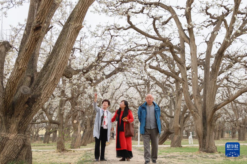 近日,游客在蘭州市皋蘭縣什川古梨園里賞花。