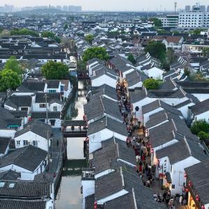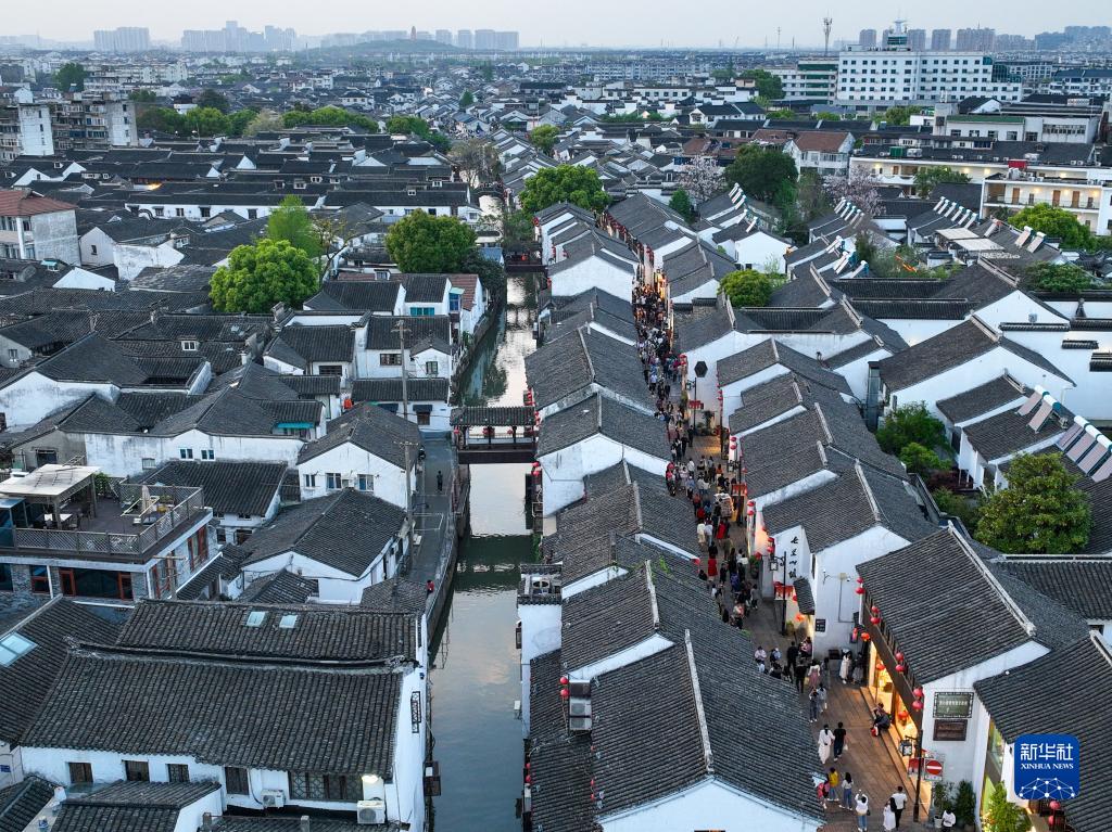 游客在江蘇蘇州山塘街休閑游玩(4月10日攝,無(wú)人機照片)。