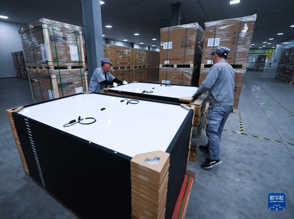 4月11日,在位于湖州吳興區織里鎮的浙江貝盛綠能科技有限公司的倉庫內,工作人員在打包出口歐洲的光伏組件。