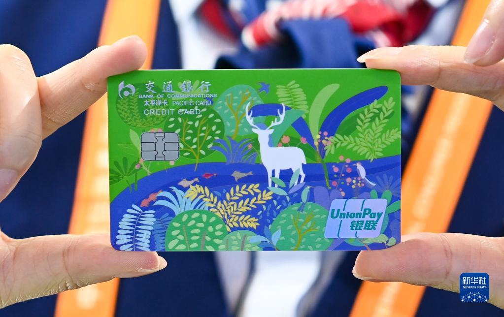 交通銀行工作人員展示交通銀行綠色低碳主題信用卡,該產(chǎn)品卡面使用了可降解的環(huán)??ɑ?月10日攝)。