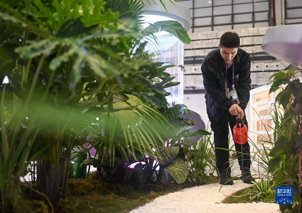工作人員為種植在消博會(huì )展臺上的綠植澆水(4月8日攝)。