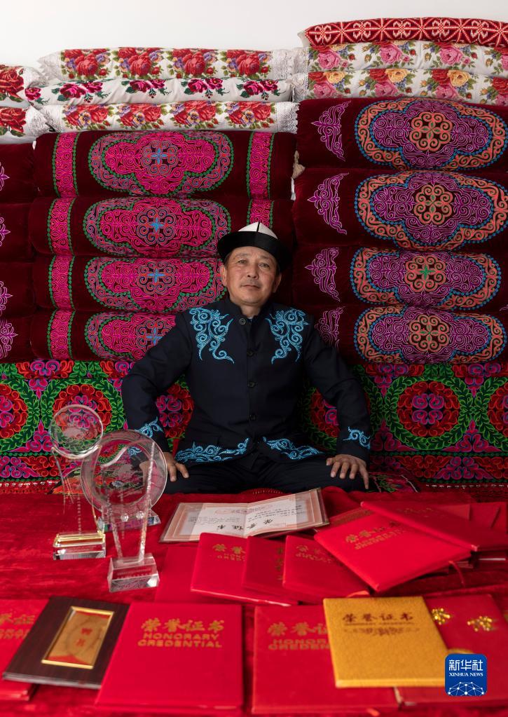 4月10日,在阿合奇村,阿不都別克展示自己獲得的《瑪納斯》演唱比賽獲獎證書(shū)和獎杯。