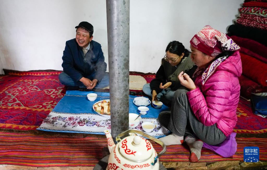 4月10日,在阿合奇縣哈拉奇鄉阿合奇村,46歲的阿不都別克(左)和家人吃早飯。