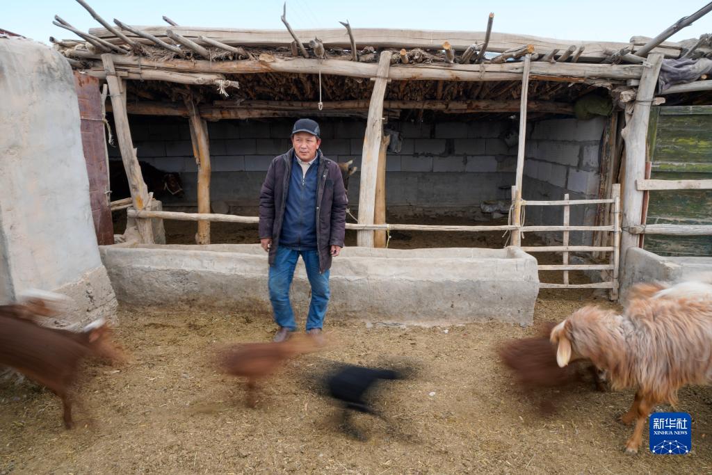 4月10日,在阿合奇縣哈拉奇鄉阿合奇村,阿不都別克在喂羊。