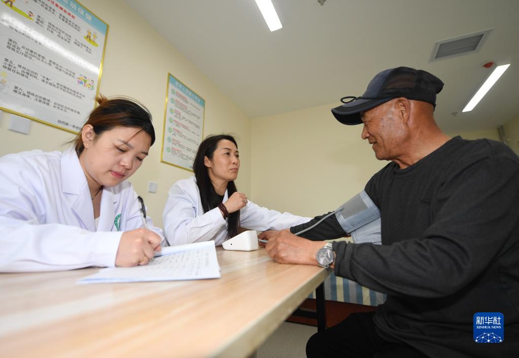 河北雄安新區容西第一養老驛站工作人員為老人測量血壓(4月10日攝)。
