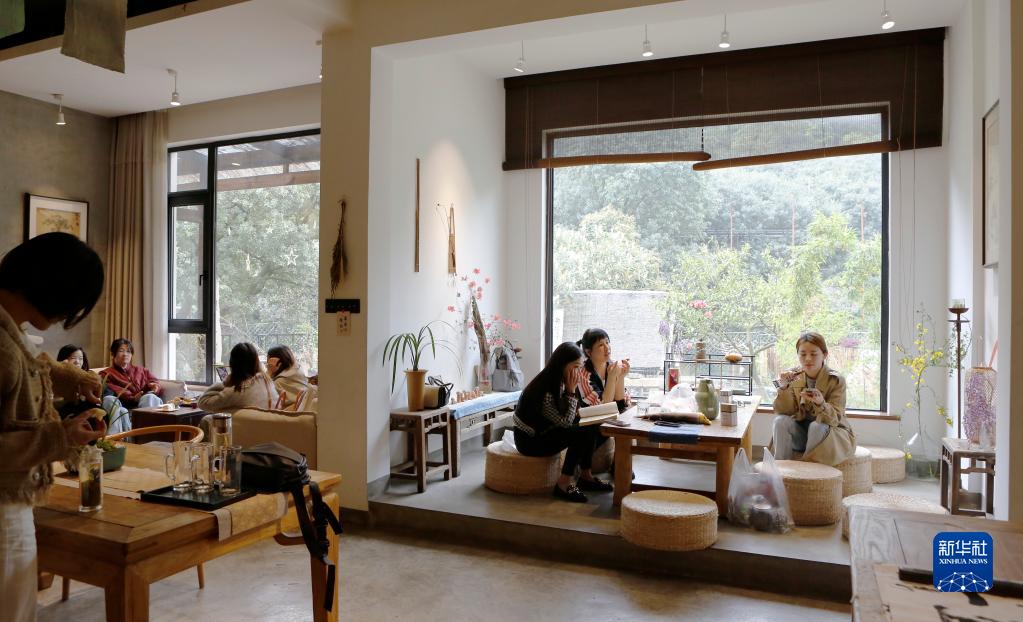 4月6日,游客在江蘇省蘇州市高新區通安鎮樹(shù)山村的民宿“蘭兮小筑”內喝茶休息。 新華社記者 柳文惠 攝