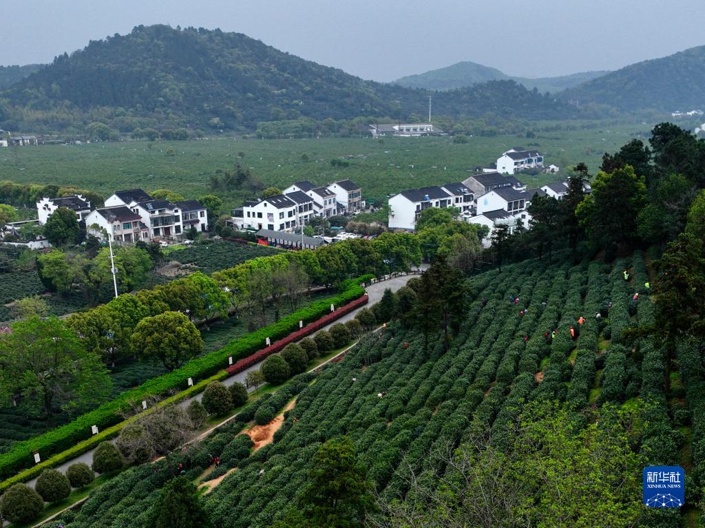4月7日,采茶工在樹(shù)山村的茶園里采茶(無(wú)人機照片)。 新華社記者 李博 攝