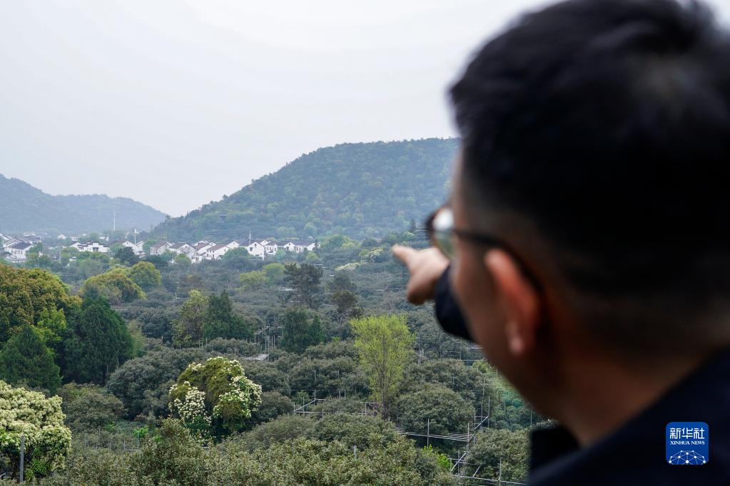 4月6日,彭銳在觀(guān)景平臺遠眺樹(shù)山村。 新華社記者 李博 攝