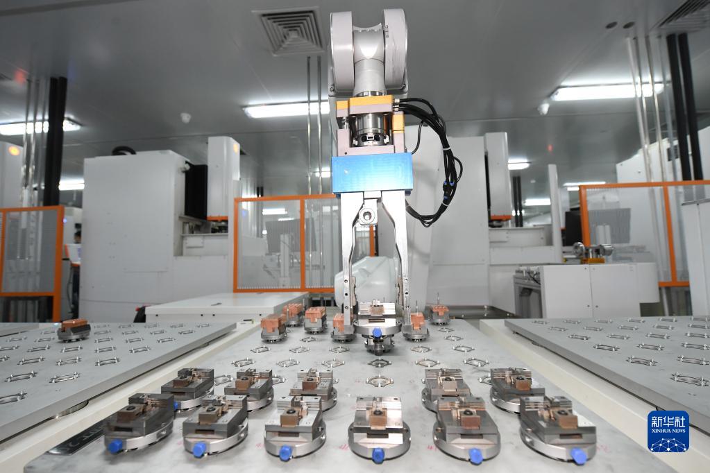 4月11日,在位于余姚的貝隆精密科技股份有限公司,智能機器人在抓取制作模具的工件。