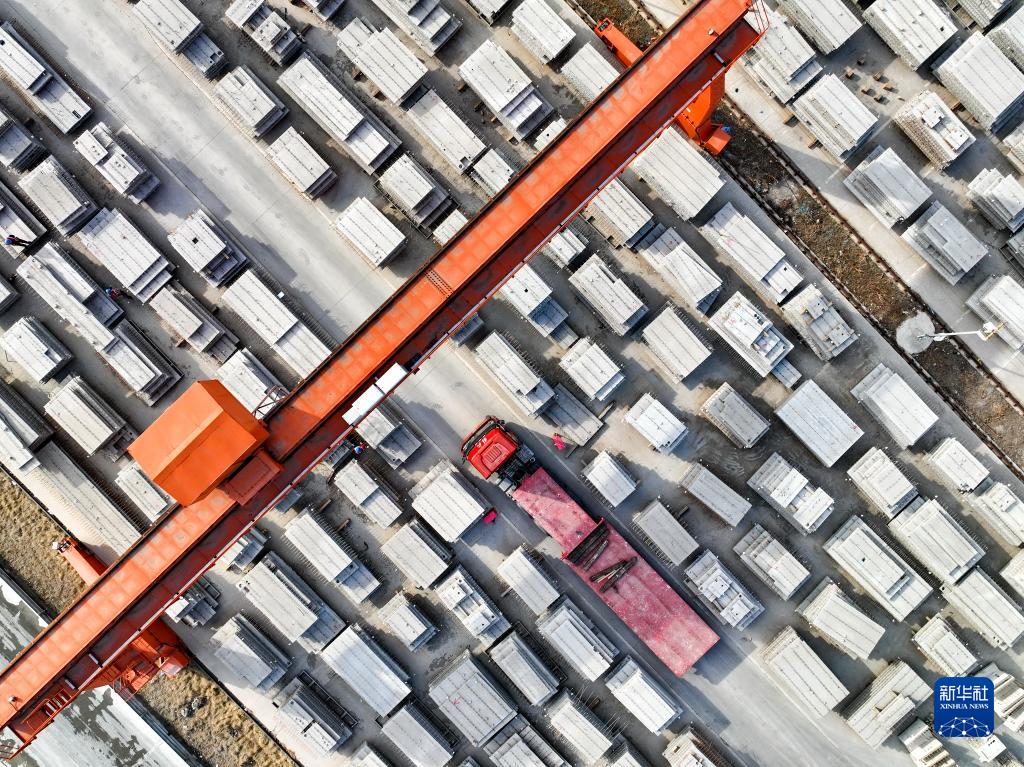 4月11日,卡車(chē)在河北省玉田縣一家裝配式建筑制造企業(yè)產(chǎn)品存放區內準備運輸產(chǎn)品(無(wú)人機照片)。