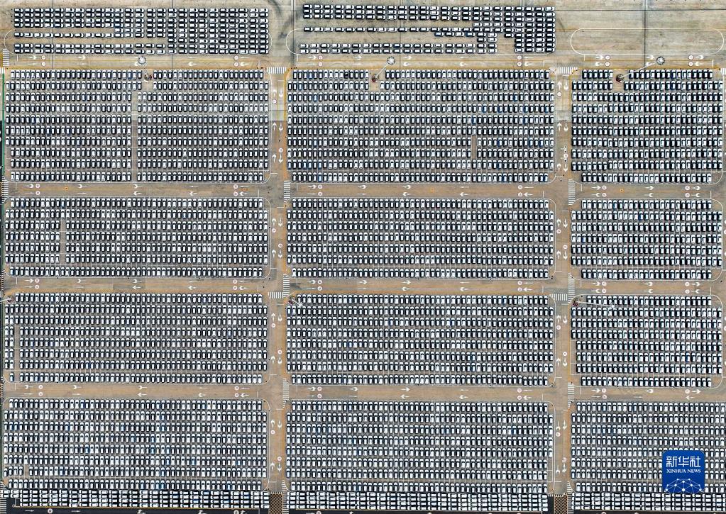 在天津港海嘉滾裝碼頭,汽車(chē)排列整齊,等待裝船(4月10日攝,無(wú)人機照片)。