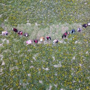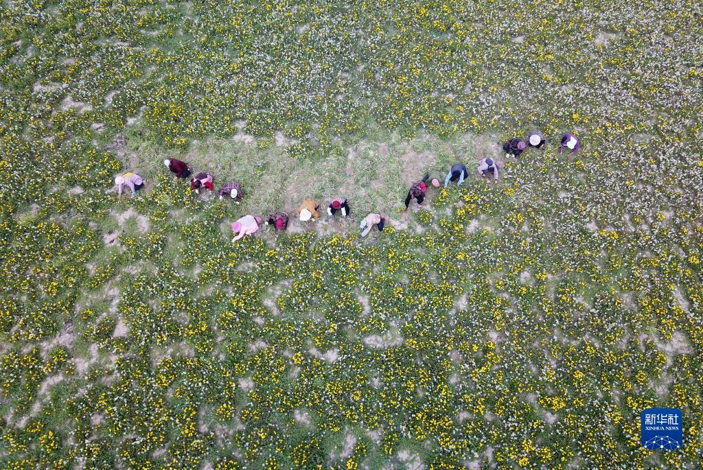 4月11日,在山東省單縣龍王廟鎮,村民在蒲公英種植田收割蒲公英(無(wú)人機照片)。