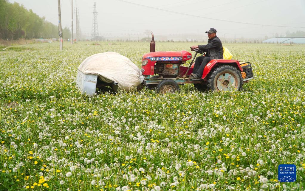 4月11日,在山東省單縣龍王廟鎮,一名村民使用農用機械設備收集蒲公英種子。