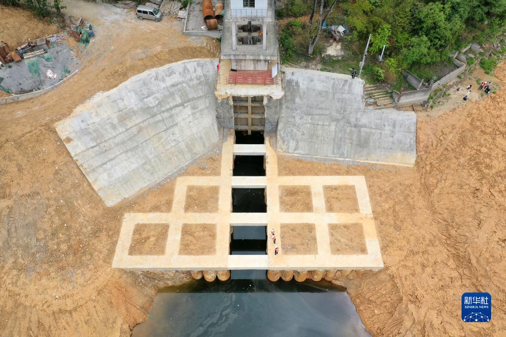4月11日,工作人員在阿哈水庫新建的放空洞設施上巡查(無(wú)人機照片)。