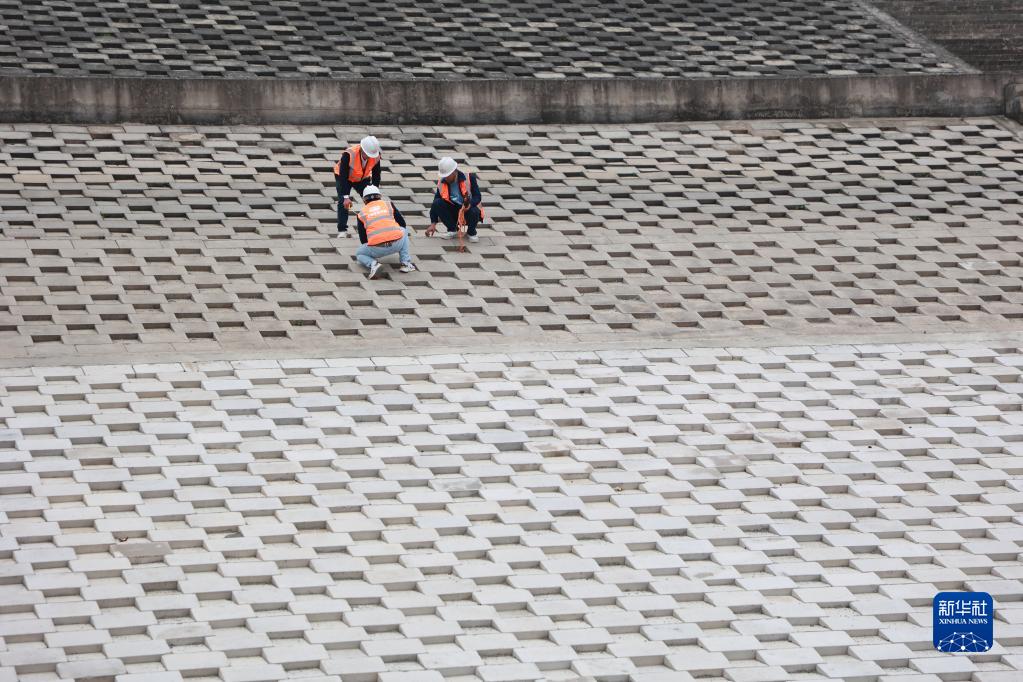 4月11日,工作人員在阿哈水庫大壩壩面上檢查。