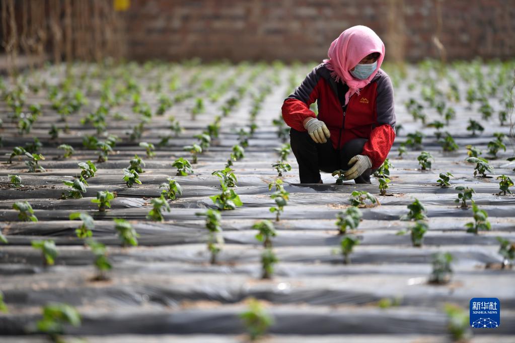 4月11日,農民在靜寧縣界石鋪鎮李堡村現代設施農業(yè)產(chǎn)業(yè)園里勞作。