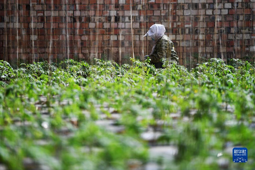 4月11日,農民在靜寧縣界石鋪鎮李堡村現代設施農業(yè)產(chǎn)業(yè)園里勞作。