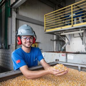 3月25日,在位于巴西圣保羅州雅爾迪諾波利斯的隆平巴西種子工廠(chǎng),一名工作人員展示玉米種子。