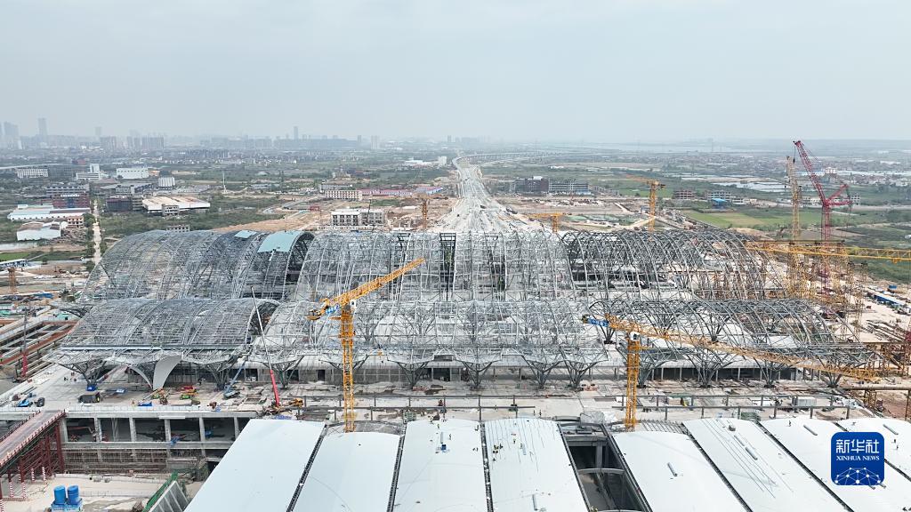 4月12日拍攝的在建的南昌東站站房工程外景(無(wú)人機照片)。