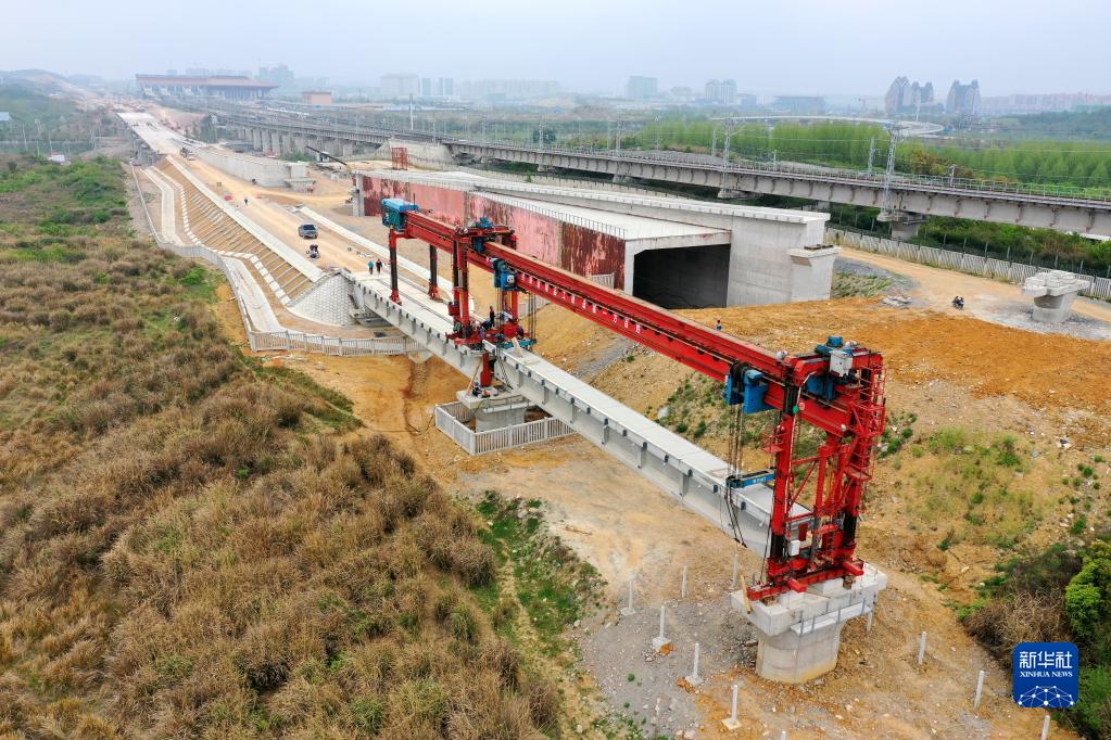 4月12日,工作人員使用架梁機進(jìn)行預制梁架設(無(wú)人機照片)。