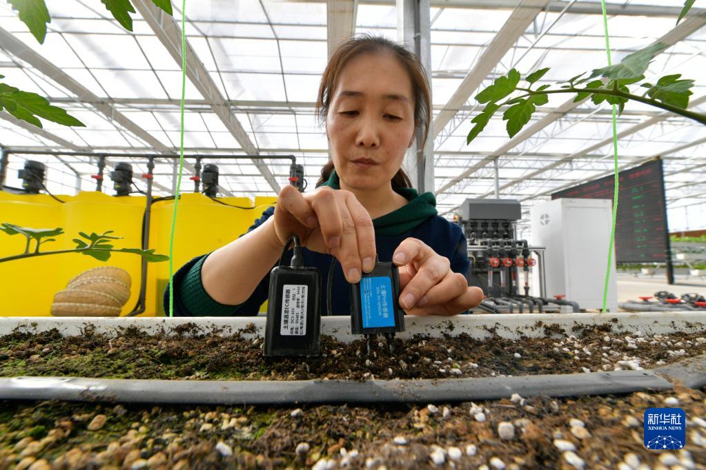 在張掖市甘州區黨寨鎮陳寨村玻璃溫室大棚內,甘州區農業(yè)技術(shù)推廣中心科技特派員將土壤PH傳感器插入土壤(4月10日攝)。