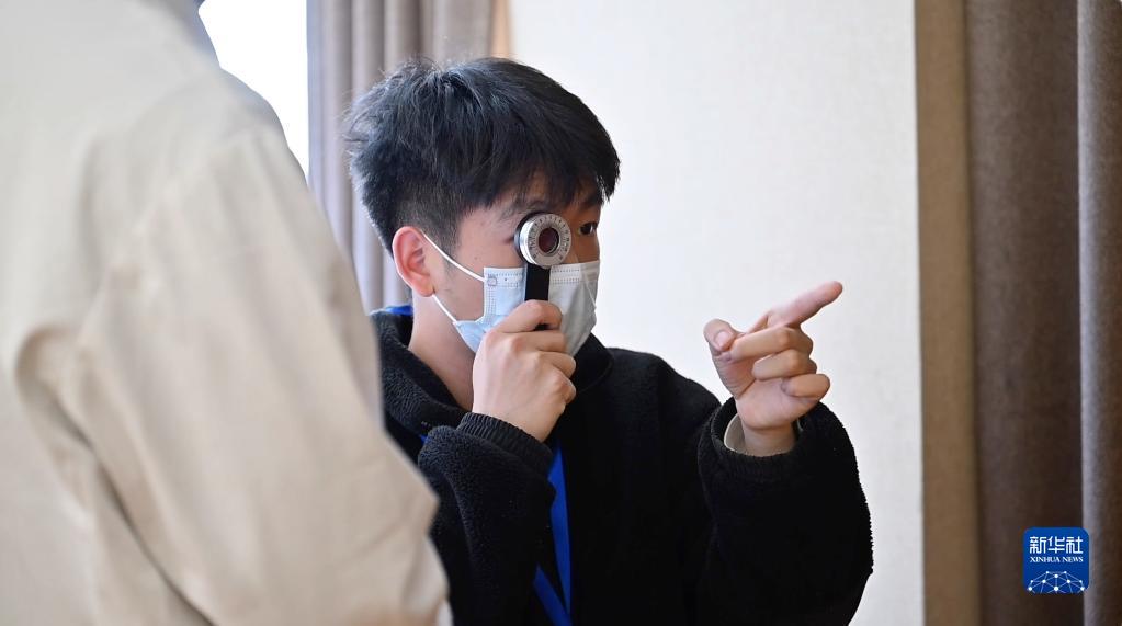 醫生為參加海軍招飛選拔的學(xué)生進(jìn)行視力檢查(2023年4月2日攝,視頻截圖)。新華社記者 許楊 攝