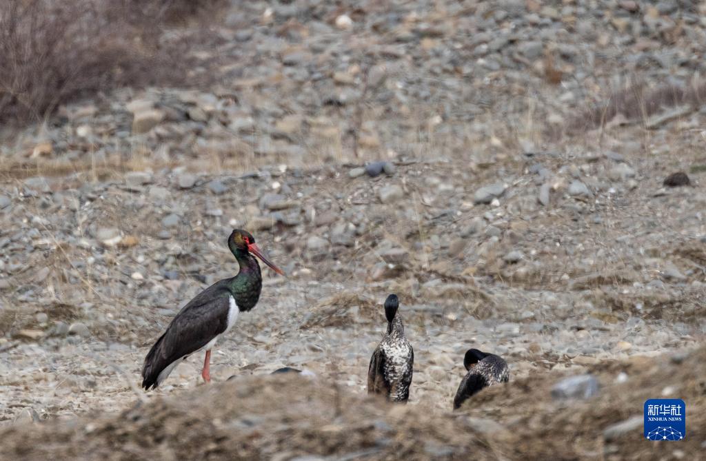 4月12日,黑鸛(左一)在色達縣康勒鄉河灘邊休憩。