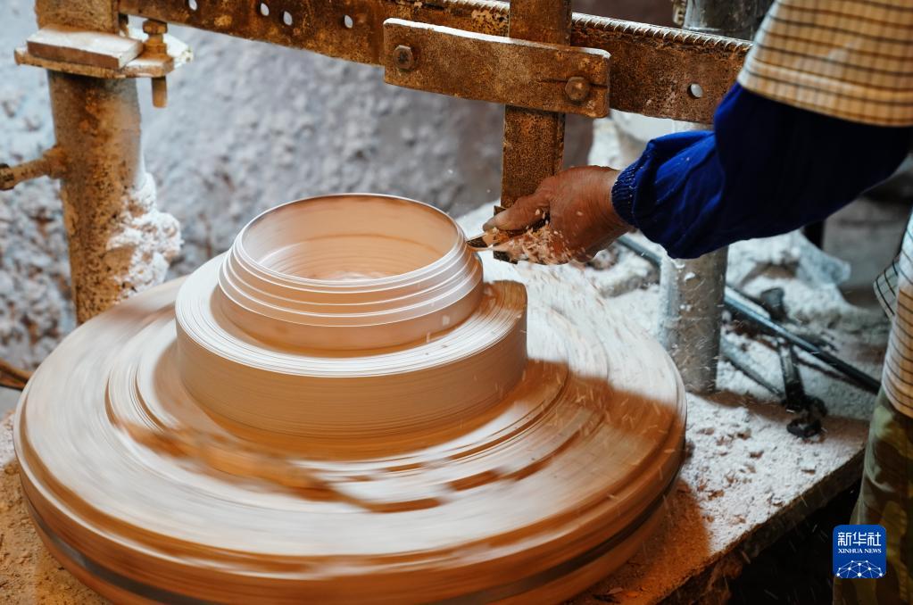 4月12日,在廣西欽州市,員工在坭興陶生產(chǎn)車(chē)間制作模具。