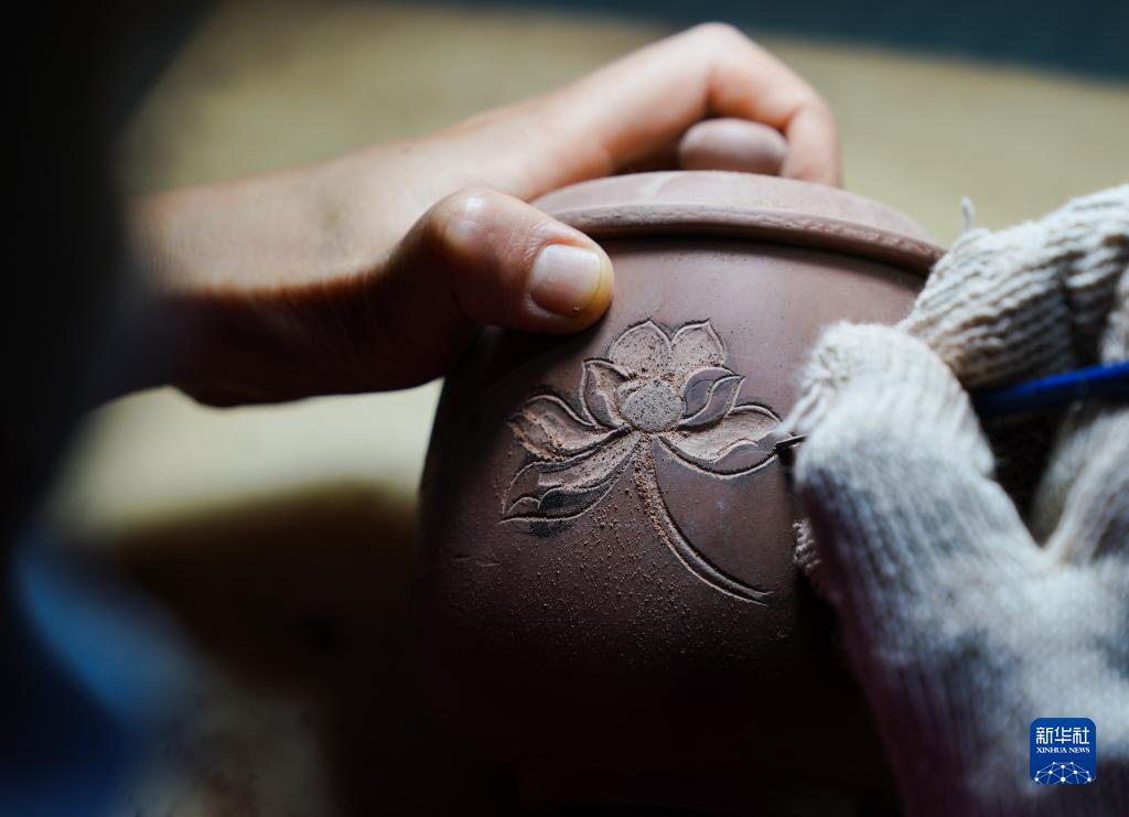 4月11日,在廣西欽州市,員工在坭興陶生產(chǎn)車(chē)間進(jìn)行雕刻工作。