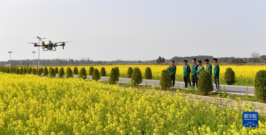 3月7日,黃從明的團隊操控無(wú)人機在油菜田噴施肥料。