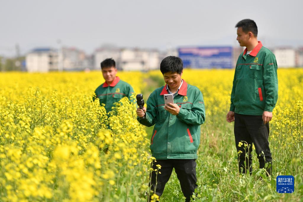 3月7日,黃從明(中)和團隊成員用測繪器測量農田面積。