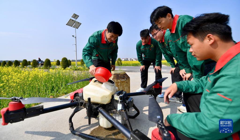 3月7日,黃從明(左一)將肥料倒至無(wú)人機的儲物箱內,準備對油菜田噴施肥料。