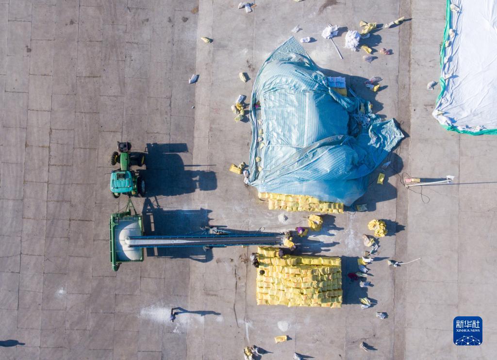 在建設農場(chǎng)有限公司,許志國的兒子許呈浩駕駛拖拉機裝運肥料(4月8日攝,無(wú)人機照片)。