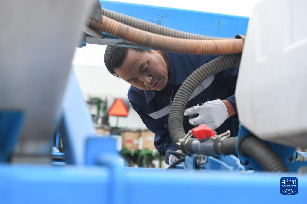 4月12日,在建設農場(chǎng)有限公司第四管理區農機中心,許志國在復檢用于播種的農機具。