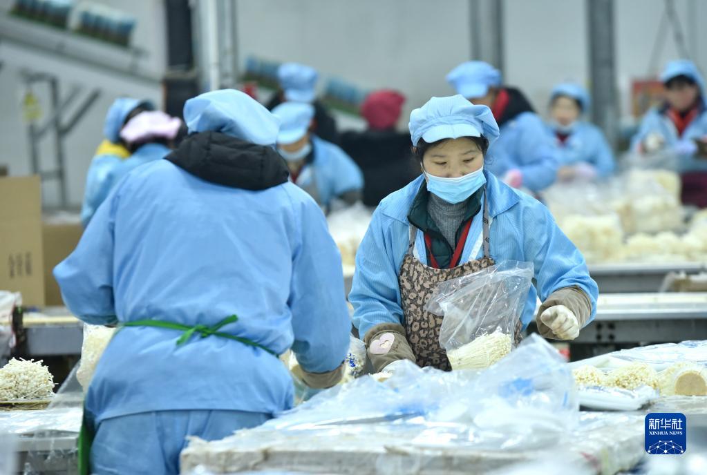 4月13日,河北省臨西縣一家食用菌生產(chǎn)企業(yè)的員工在包裝車(chē)間分揀金針菇。