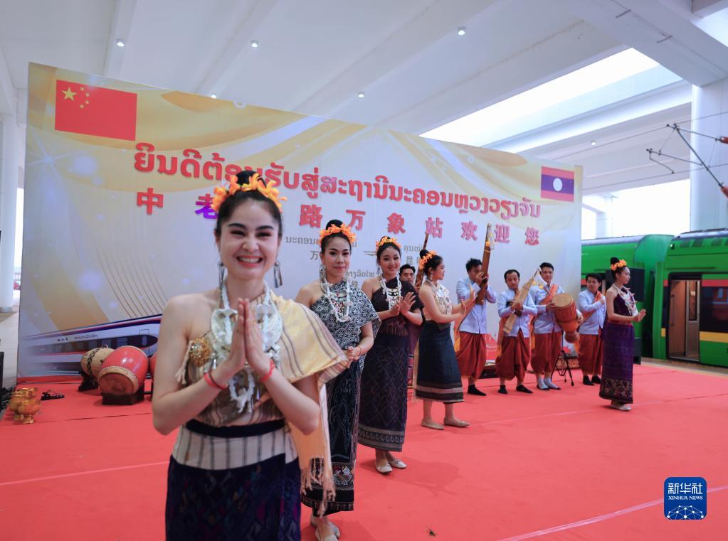 4月13日,在中老鐵路老撾萬(wàn)象站,工作人員歡迎乘坐D887次國際旅客列車(chē)的旅客。