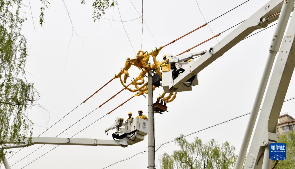 4月13日,工作人員在進(jìn)行配電網(wǎng)帶電檢修工作。