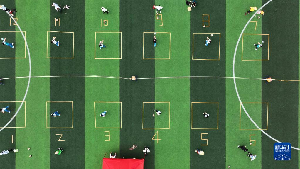 4月13日,在貴州省錦屏縣第四中學(xué),考生參加排球測試(無(wú)人機照片)。