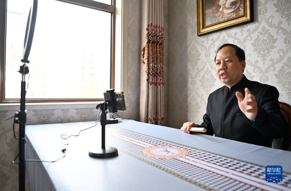 謝連華在家里錄制口述村志故事的短視頻(4月12日攝)。