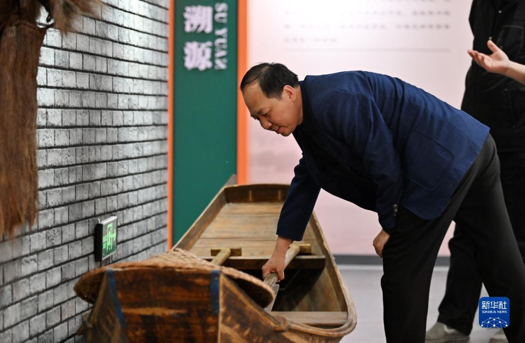 謝連華在天津市西青區小稍直口村史館內查看舊漁船(4月9日攝)。