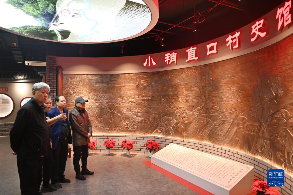謝連華(右二)在天津市西青區小稍直口村史館參觀(guān)(4月9日攝)。