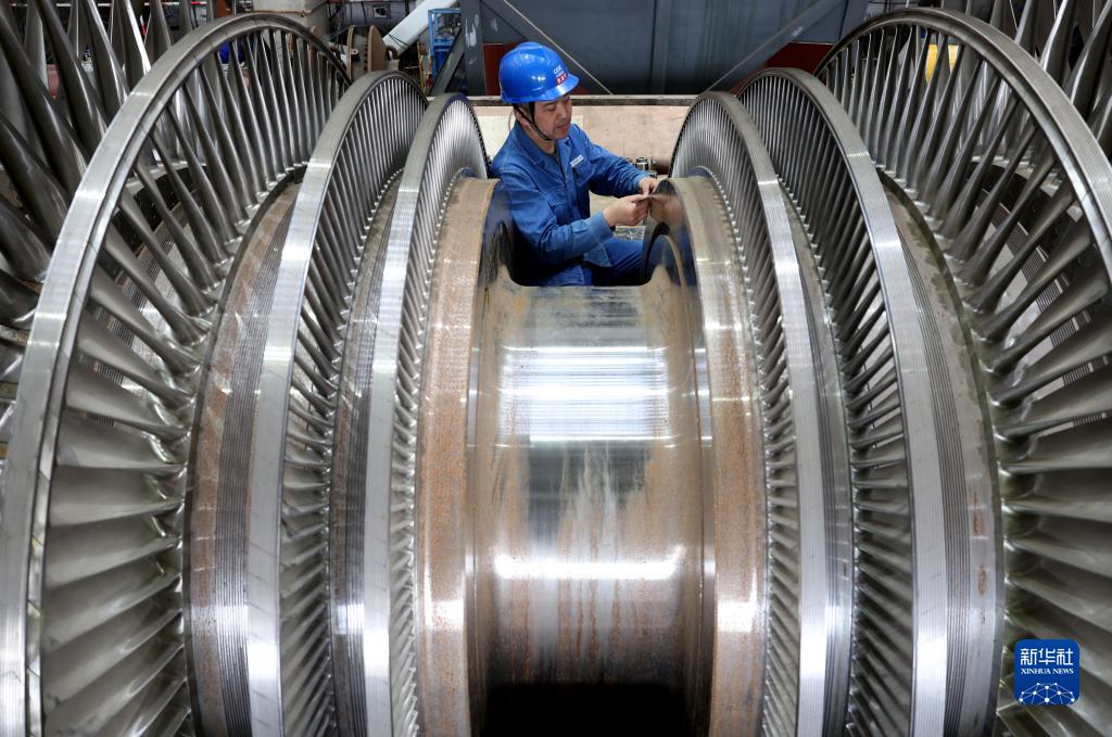 4月13日,一名工人在江蘇省射陽(yáng)縣射陽(yáng)港電廠(chǎng)四期百萬(wàn)千瓦燃煤發(fā)電機組1號汽輪機組設備安裝現場(chǎng)工作。