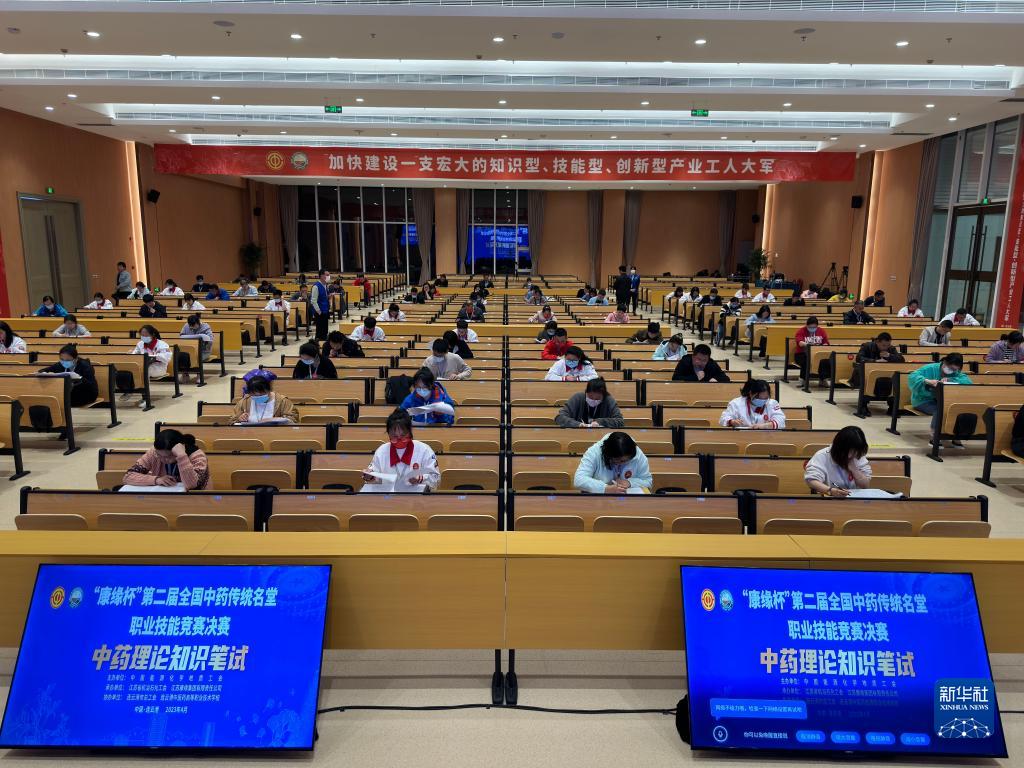 4月12日,在江蘇省連云港市舉行的第二屆全國中藥傳統名堂職業(yè)技能競賽決賽上,選手參加中藥理論知識筆試。