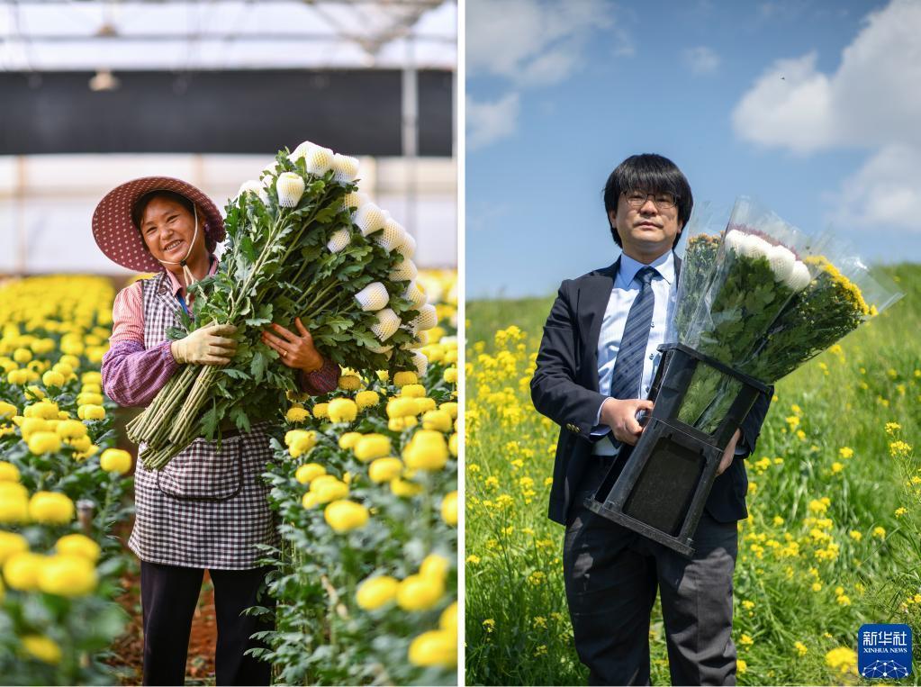這是一張拼版照片,左圖為3月22日云南省開(kāi)遠市的花農李蘭英在展示采摘的鮮花(新華社記者 江文耀 攝);右圖為4月3日在日本埼玉縣三鄉市,經(jīng)營(yíng)花卉公司的小西武出發(fā)給訂貨花店送花前走過(guò)一片花田(新華社記者 張笑宇 攝)。