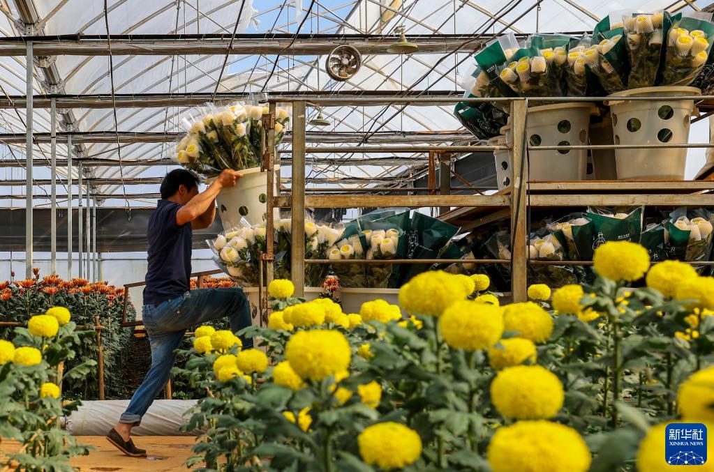 云南省開(kāi)遠市鮮花基地內的工作人員準備將包裝好的鮮花運送到倉庫(3月22日攝)。