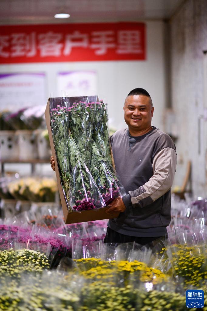 云南省開(kāi)遠市鮮花基地內的工作人員羅猛展示裝箱的鮮花(3月22日攝)。