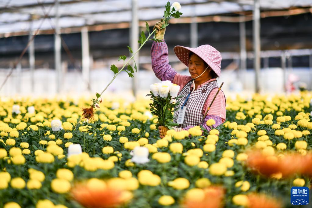 云南省開(kāi)遠市的花農李蘭英在采摘鮮花(3月22日攝)。