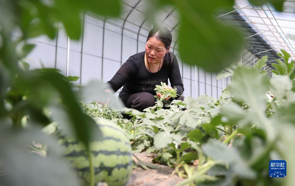 4月13日,農民在山東省臨沂市臨沭縣大興鎮一處西瓜種植大棚內進(jìn)行田間管理。
