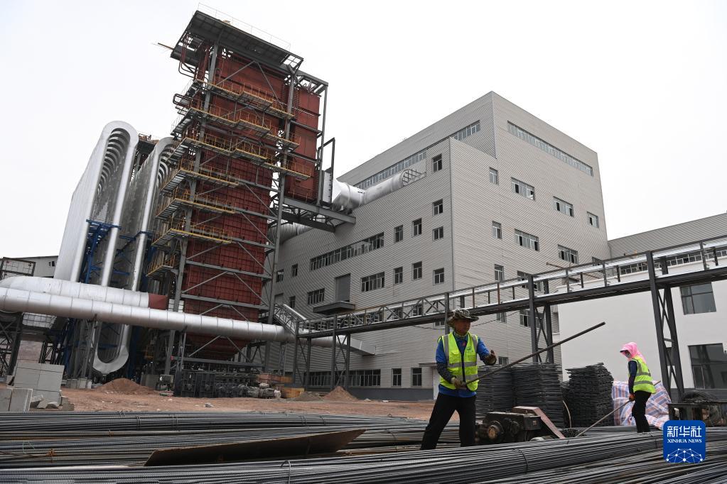 4月13日,工人在位于張掖市甘州區的20萬(wàn)噸硅系新材料綜合利用項目建設現場(chǎng)施工。